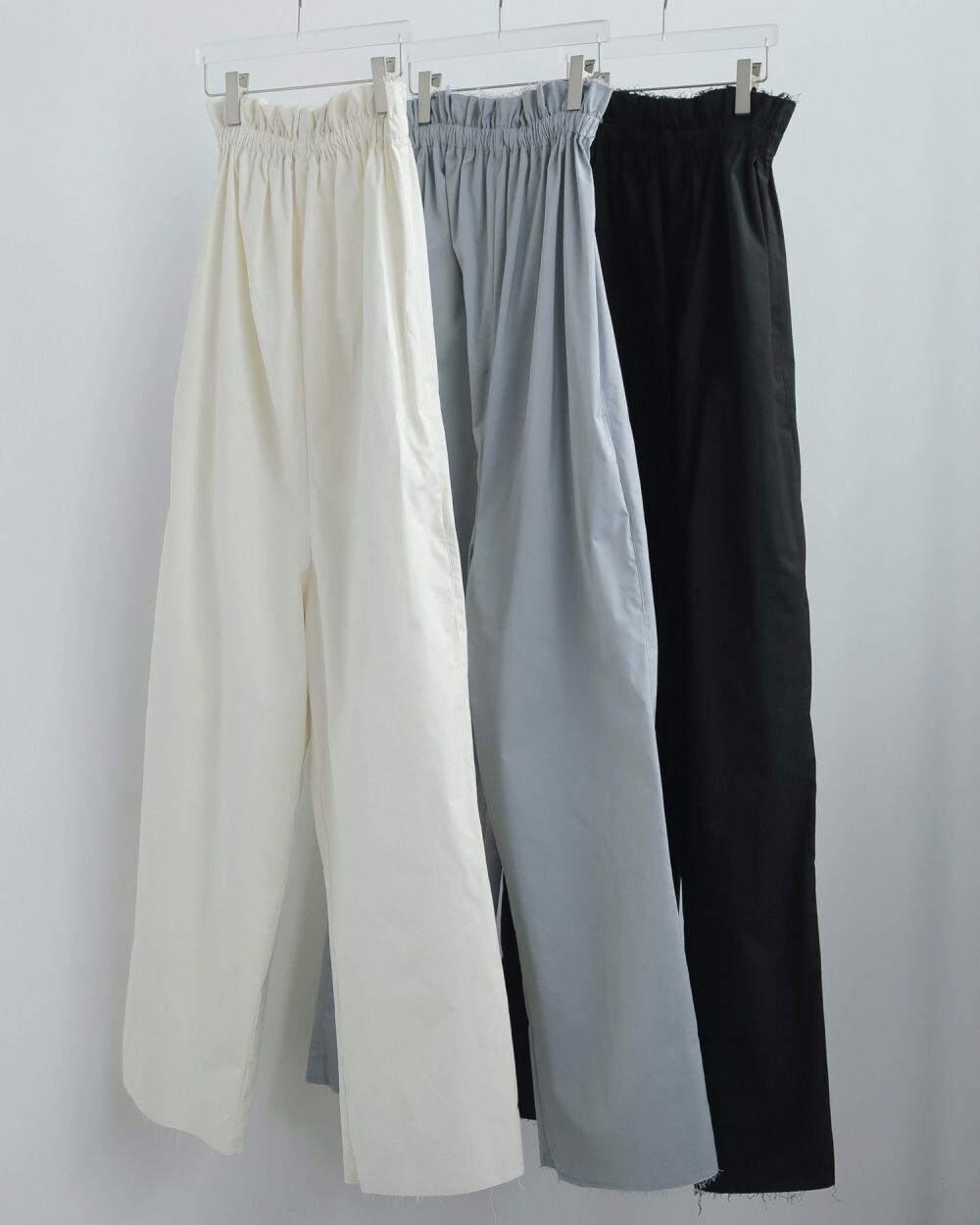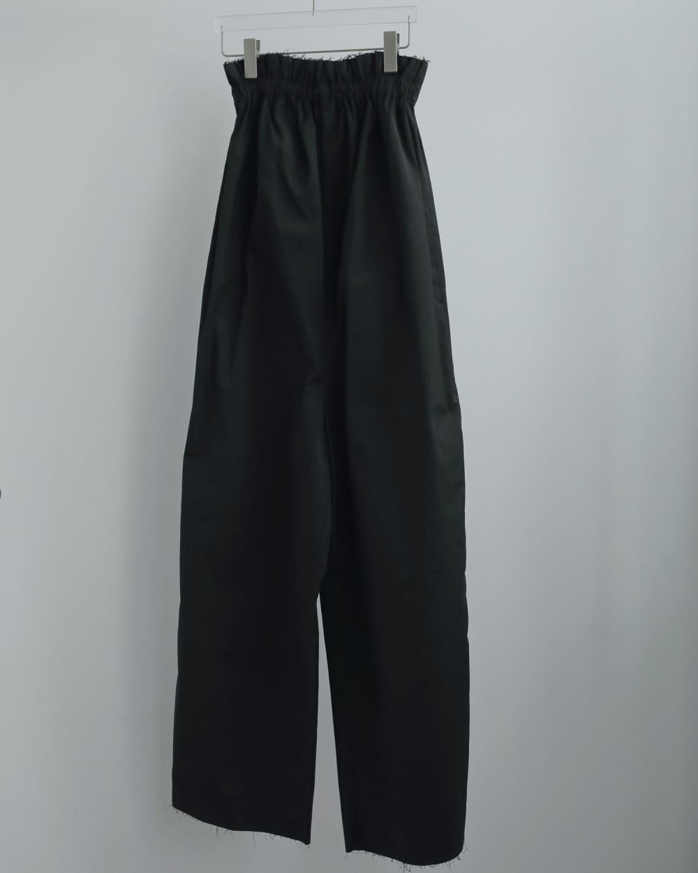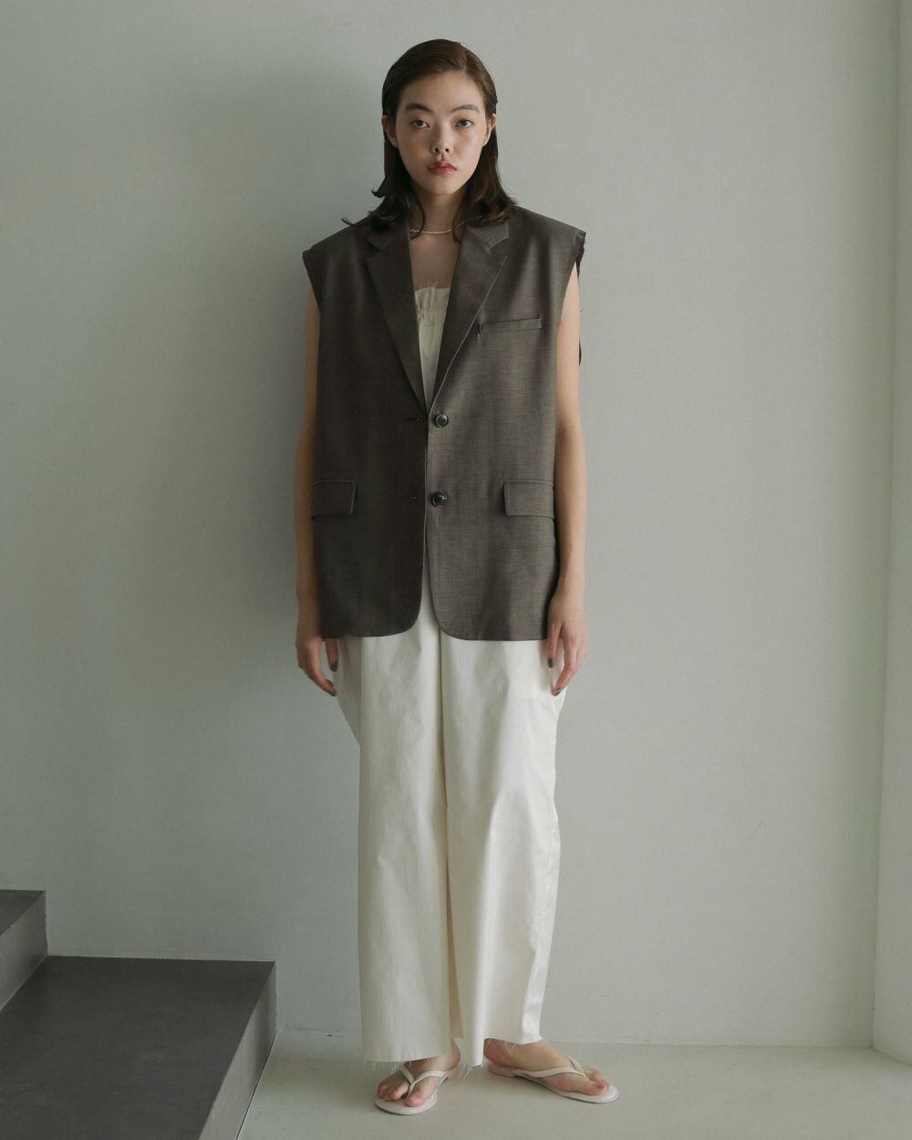 カットオフで仕上げたベアコンビネゾン。ギャザーをたっぷりと寄せたフリルのような胸元がポイント。艶感のある素材を使い、上品に着ていただける一枚。ジャケットを合わせたり、小物使いでオケージョンシーンに着ていただくのもおすすめです。ワイドシルエットで、体のラインを拾わず、幅広いシューズと合わせやすいです。