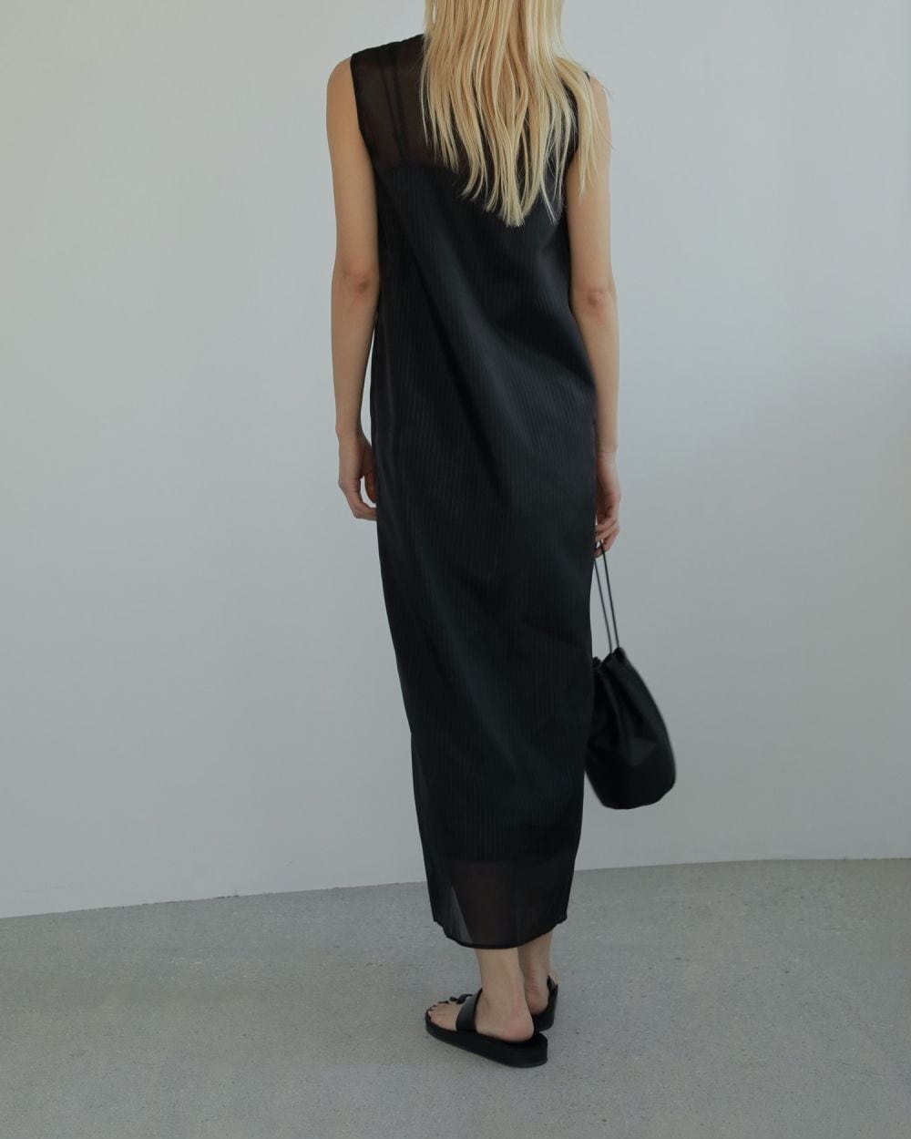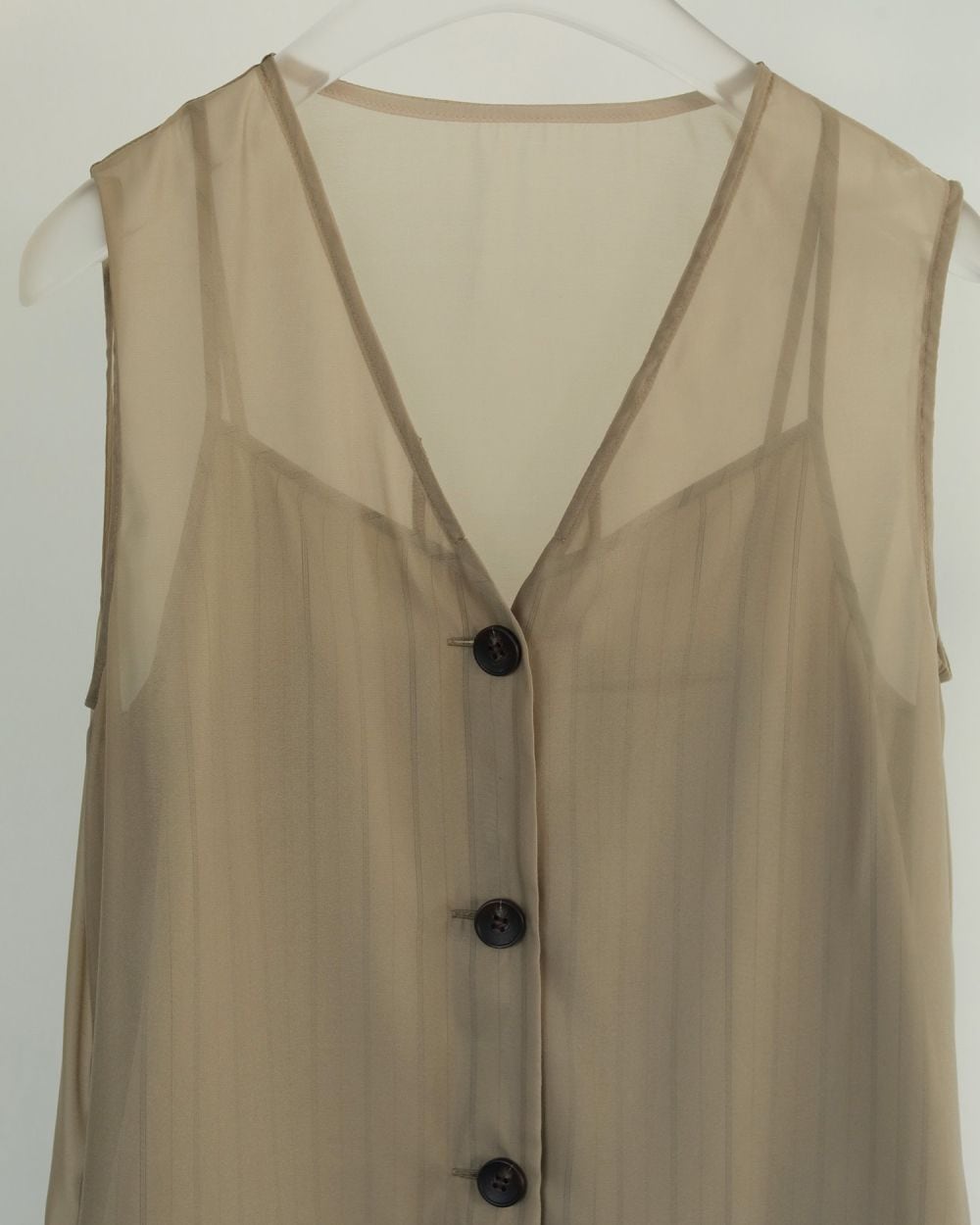 透け感のある素材にストライプ柄のキャミソールワンピースをレイヤードした、軽やかで奥行きのあるワンピース。フロントボタンデザインがアクセントになった、マニッシュなベストのようなデザインで上品な一枚。肌に馴染む程良い透け感とさりげないストライプとの重なりが絶妙なバランスで、一枚で着ても印象的なスタイルが完成します。シンプルながら一枚で映える差のつく一着。すっきりとしたパンツをレイヤードしていただくのもおすすめです。