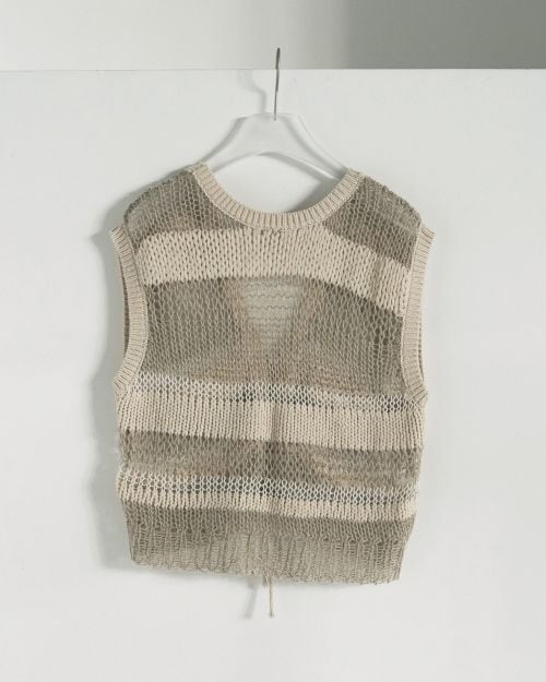 3つの異なる糸をミックスし表情ある編み地で仕上げたニットベスト。透けている部分とそうでない部分とで編み地に差をつけたボーダー柄。同じ糸を使用した部分も、絶妙に編み方を変化させています。一枚でノースリーブトップスとしてはもちろん、コンパクトな長袖トップスなどとレイヤードして、晩夏から秋冬まで長く着まわしていただけます。深めのVネックとリボン使いがコーディネートに映えるバックスタイルもポイント。Vネック側を前にして、前後2WAYで着用可能です。