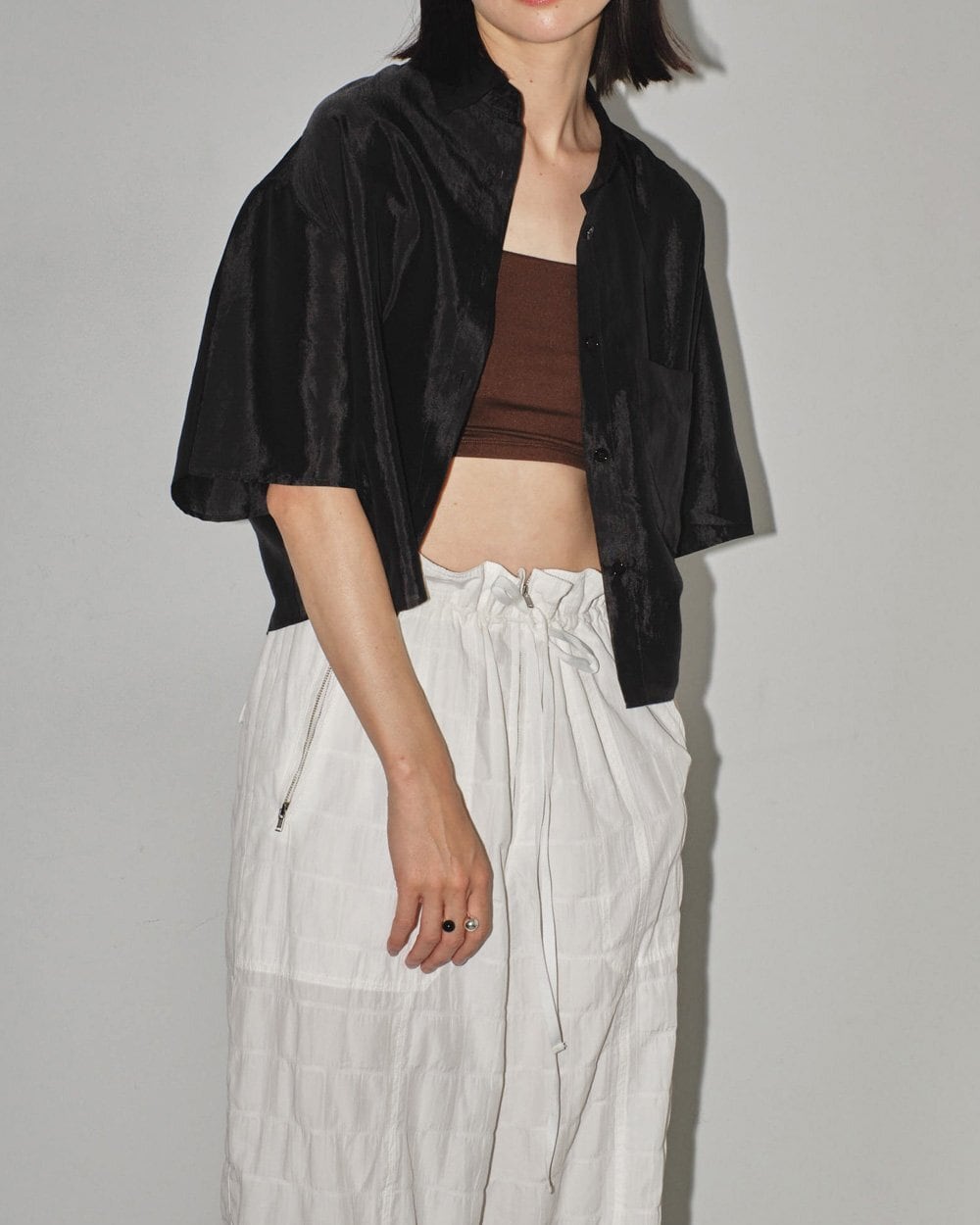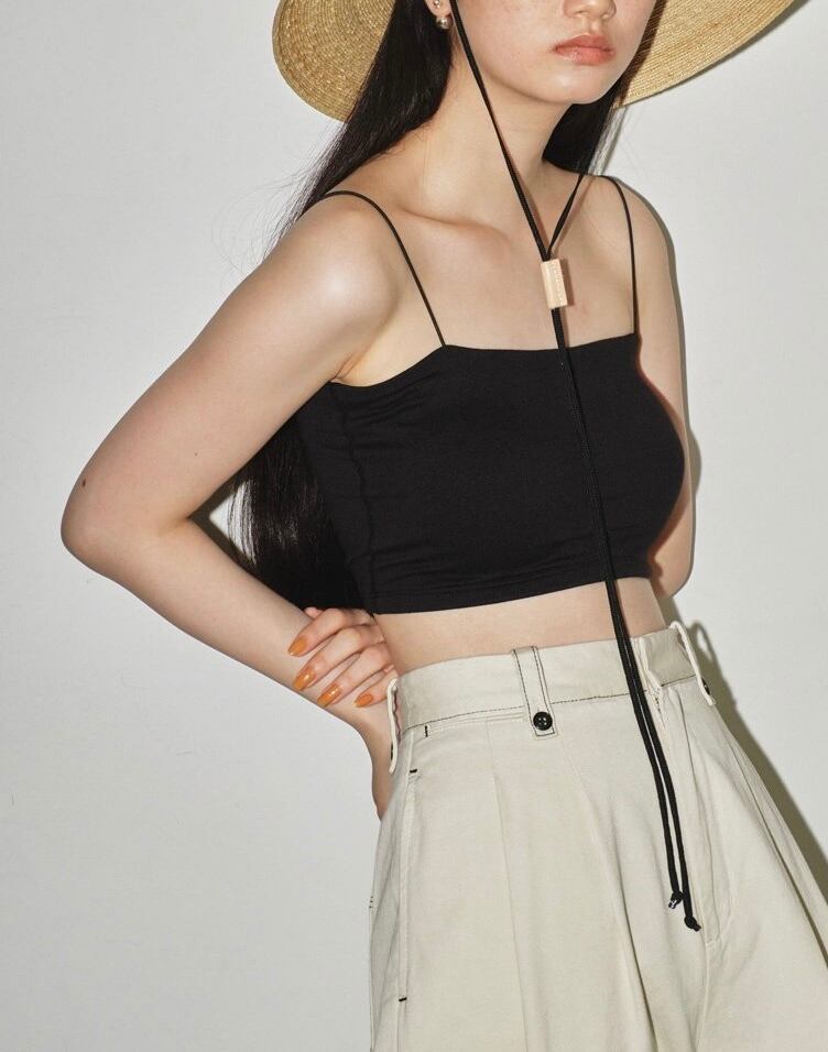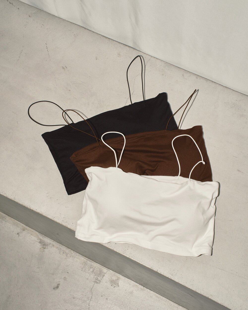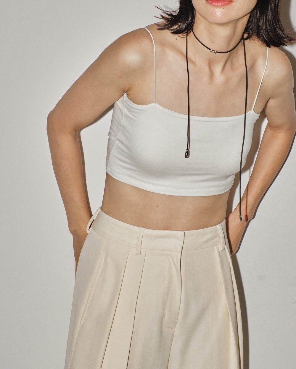 上品な光沢があり肌触りのいいカットソー生地を使用したブラトップ。トップスにラインが響きにくく、すっきりとしたシルエットが魅力の一枚。華奢なストラップと直線的なネックラインがヘルシーな印象に。透け感のあるトップスや背中のあいたワンピースなどのインナーにおすすめです。パットは縫い付けてあります。